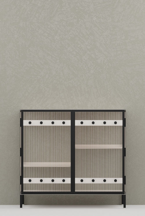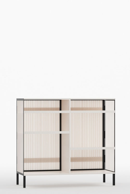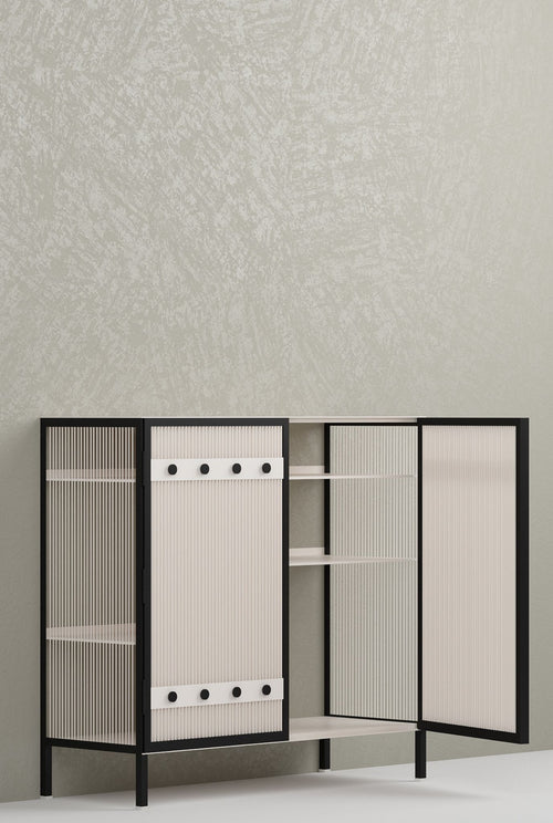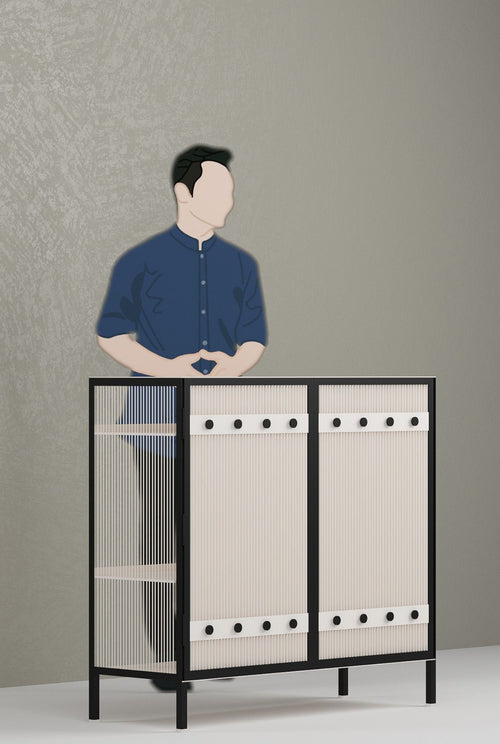 Sleek, urban, and modern — the Metro Cabinet is designed for contemporary living. With its bold grid-like frame, vertical ribbed detailing, and playful circular accents, it adds a graphic, architectural edge to any space. The clean black-and-white palette ensures it blends effortlessly with both minimal and eclectic interiors.