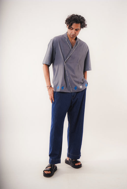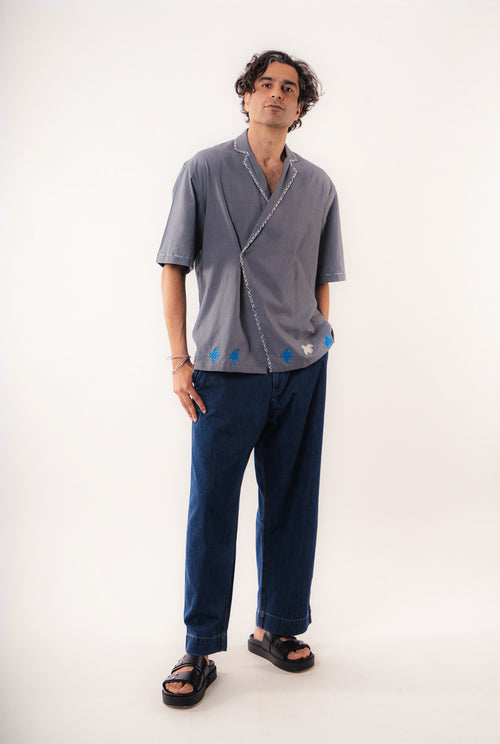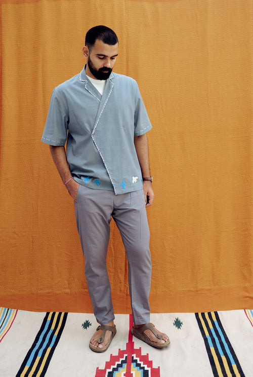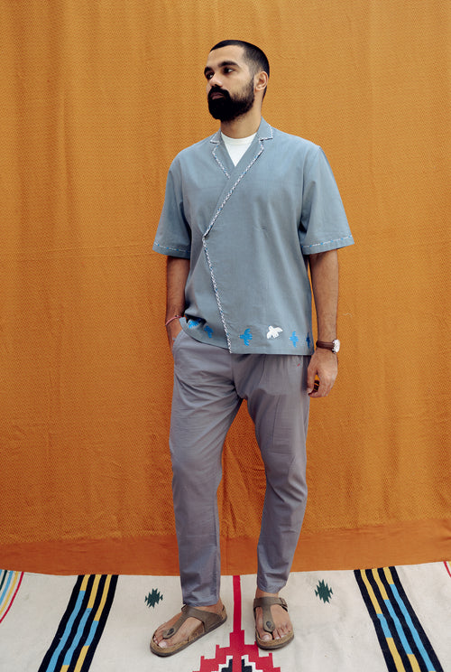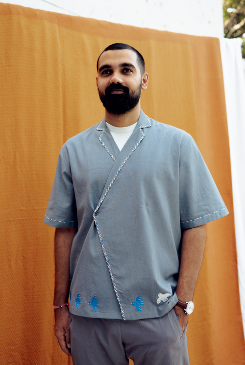 Crafted in mangalgiri cotton, and hand dip-dyed, this shirt features an overlap wrap-it giving it both a traditional and contemporary look. Its finished with embroidery details at the hem of the shirt with cool bird motifs, cross-stitch and cord detail.