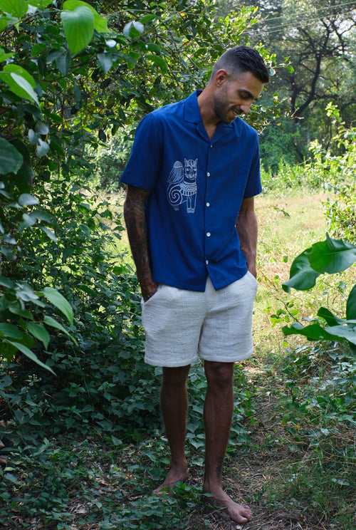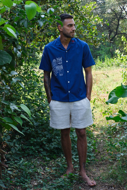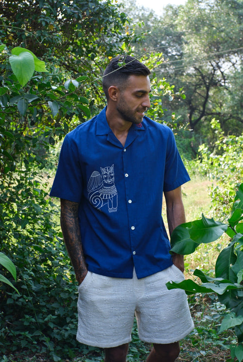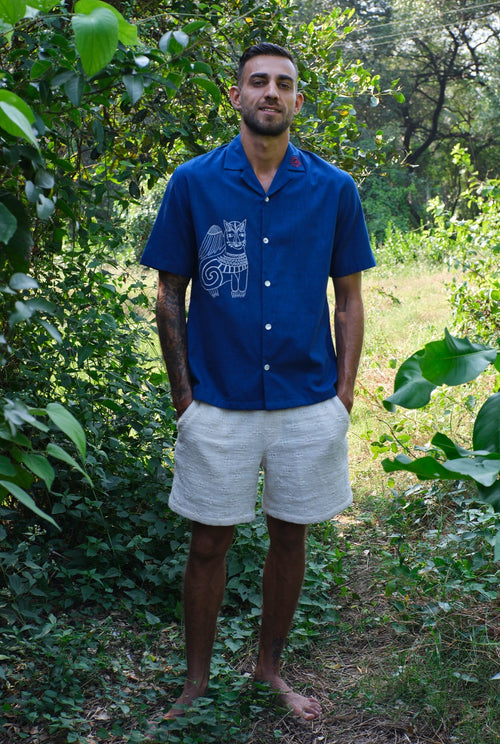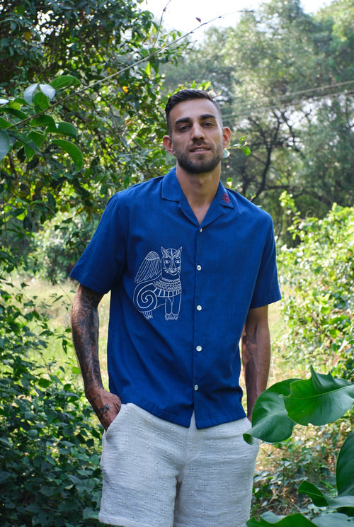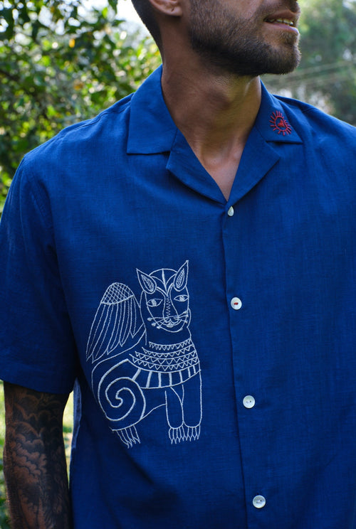 This relaxed fit shirt is hand dyed in rich hues of indigo, and features a cool camp collar and mother of pearl buttons. The stand-out detail is of course the hand embroidered animal motif.