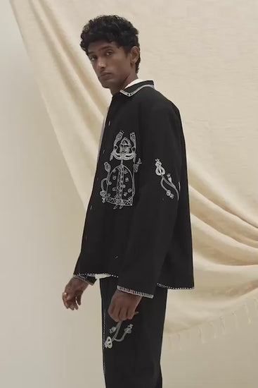 A relaxed black jacket featuring a classic collar and full sleeves, heavily detailed with intricate white hand-embroidery in narrative, figurative, and floral motifs. White contrast hand embroiderie outlines the seams, giving it a bold, storytelling aesthetic.