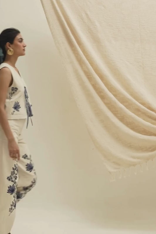 A cropped, sleeveless vest crafted from handwoven white denim. It features a V-neck and a front tie-up closure with a gingham detail. The piece is accented with rich navy blue floral applique on the chest and is perfect for adding artisan texture to a layered look.