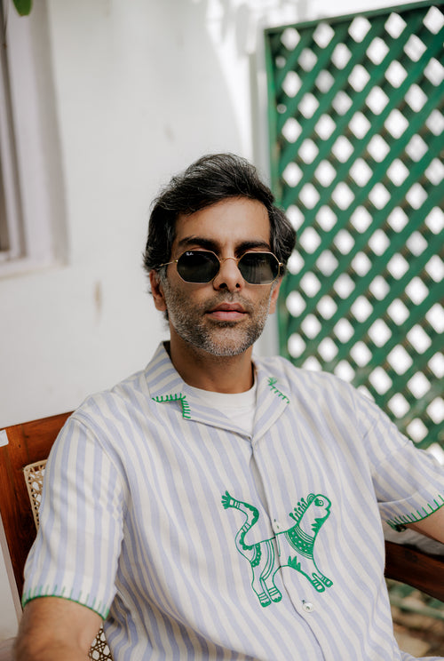 Crafted in handloom fabric, this blue and white striped shirt is sure to catch eyes with its machine-embroidered motif inspired by tribal art and details like the blanket stitch at the collar notch and sleeve hem, and mother-of-pearl buttons.