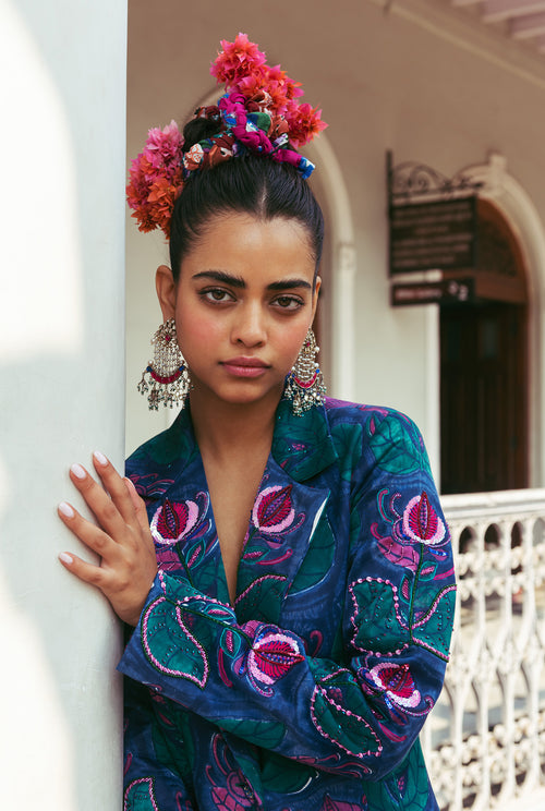 We love a great Pantsuit. We love it even more at a wedding. Essentially our most versatile piece, this piece is crafted using pure Gajji silk. The pretty pink in the motif creates a beautiful contrast against the midnight blue base. It features a hand embroidered blazer that is paired with matching flared pants.