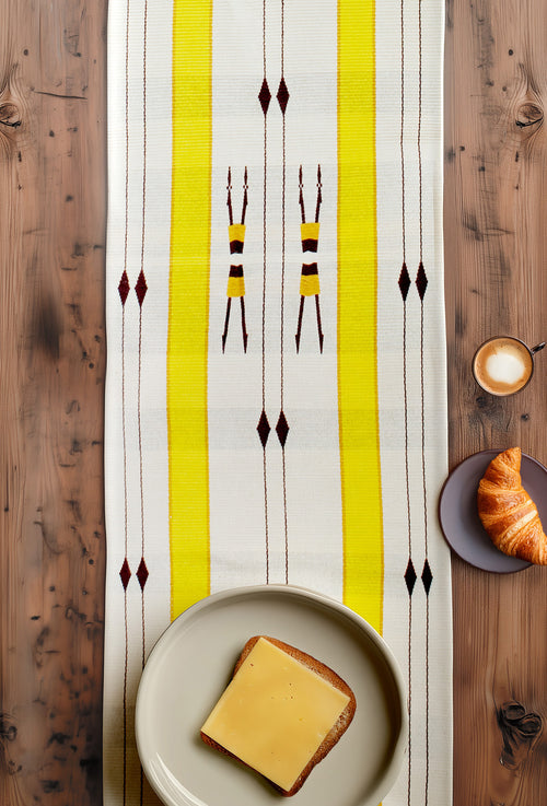 This handcrafted table runner is a masterpiece of Naga weaving traditions, demonstrating the exceptional ability of the region's women artisans. It is woven with traditional processes and contains beautiful geometric designs that evoke a sense of heritage and craftsmanship. The black woven details add an elegant touch and elevate its visual attractiveness. This table runner is the perfect combination of artistry and practicality, providing an original, handmade charm to your dining or living area.