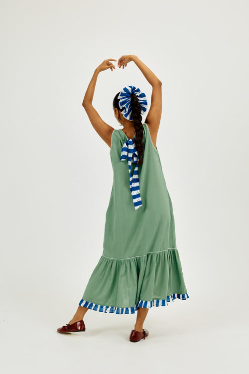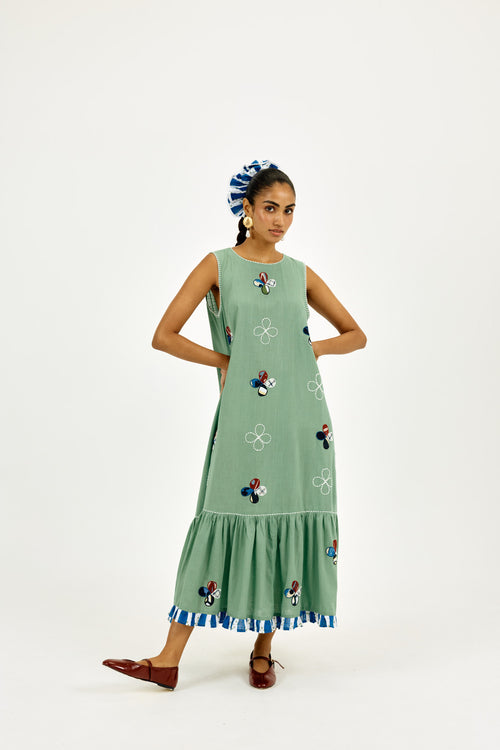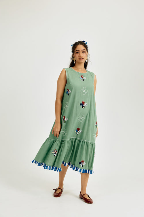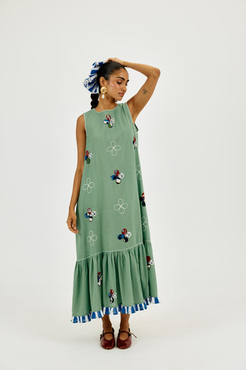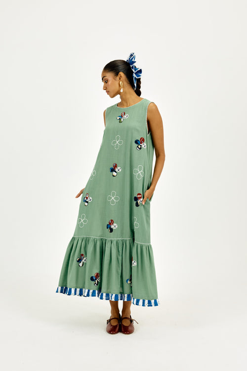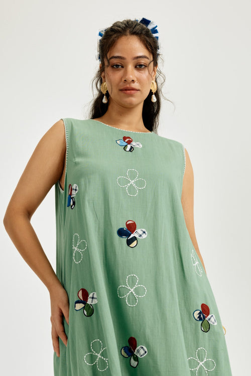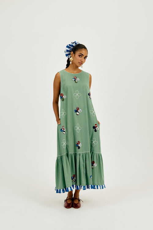 Crafted in breathable cotton and hand-dyed in seafoam green, this sleeveless midi dress features whimsical hand-cut appliqué floral motifs and delicate contrast thread embroidery. Finished with a flirty striped frill at the hem, it’s cut in an easy tiered silhouette. With a relaxed round neck, roomy fit, and hidden pockets, it’s made for breezy vacation days.