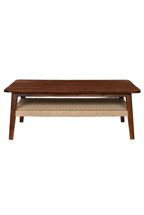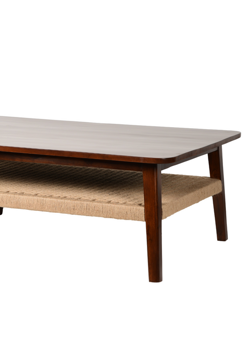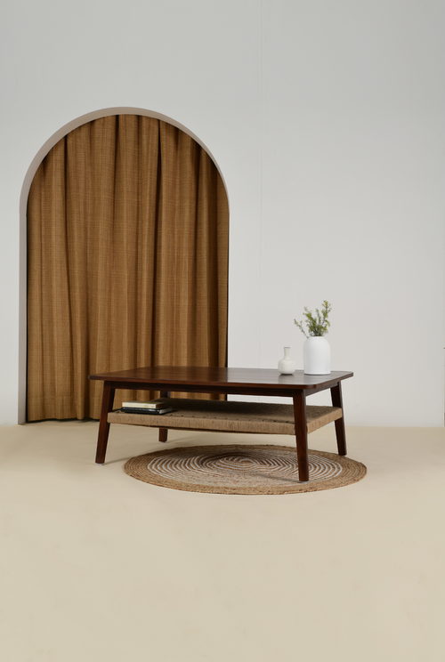 The jute wrapped around the base adds a unique texture and earthy appeal, enhancing the table's natural beauty. Perfect for gathering around with friends and family or simply as a centerpiece for your living room, Jatan coffee table seamlessly blends style and functionality.