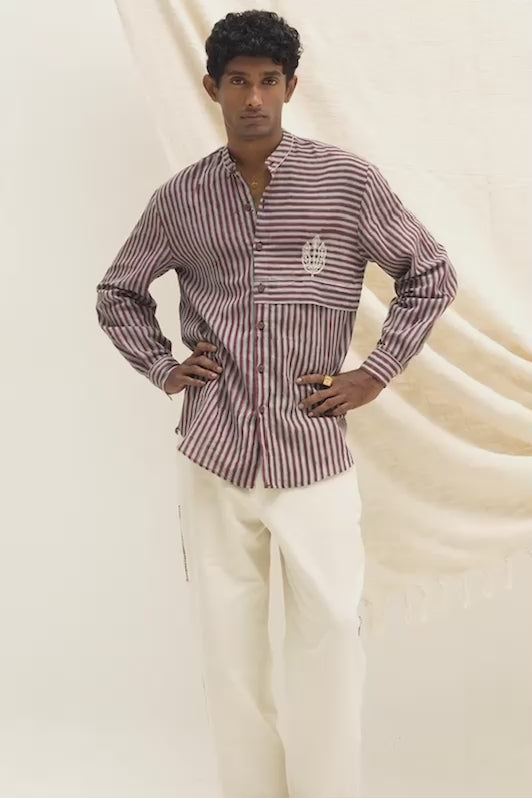 A relaxed, full-sleeved men's shirt featuring a fine maroon and grey stripe hand-block print. The shirt has a classic open collar and uniquely accented with bold white hand-embroidery on the left side panel, offering a casual, artisan-printed style.