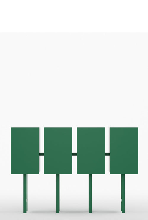 The Metro Mod Console is a contemporary green metal cabinet featuring four sleek compartments and minimalist lines. Inspired by urban architecture, its geometric design and bold color make it a striking statement piece for modern homes or offices. Sturdy, spacious, and versatile, it brings functional style and city sophistication to any room.