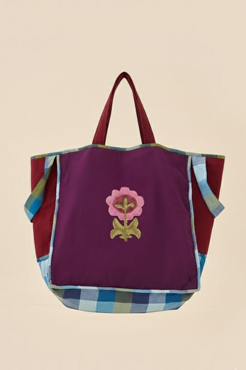 Morni Multiprint tote bag. Crafted from cotton checks with a purple dyed kala cotton fabric and floral appliqué, this roomy rectangular tote is equal parts fun and functional, finished with contrast handles and a spacious front pocket for grab‑and‑go days.