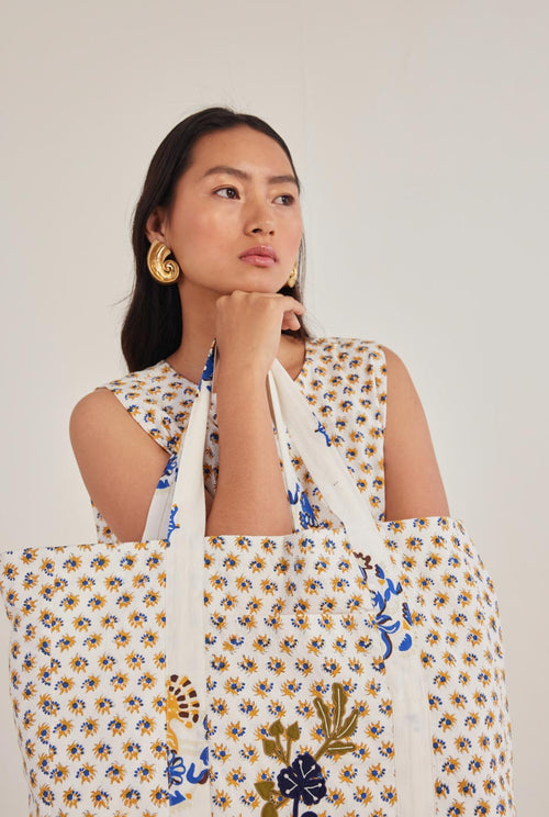 Moro applique embroidery tote bag- Crafted in our handblock-printed Moro print, this tote is equal parts fun and functional. With a roomy front pocket, a sleek rectangular shape, and contrast fabric handles, it’s made for all your grab-and-go moments.