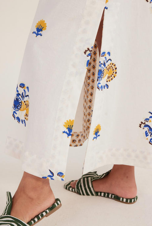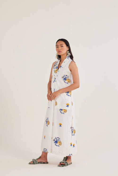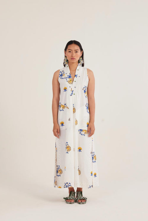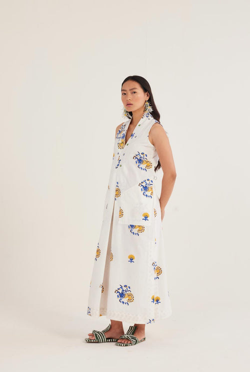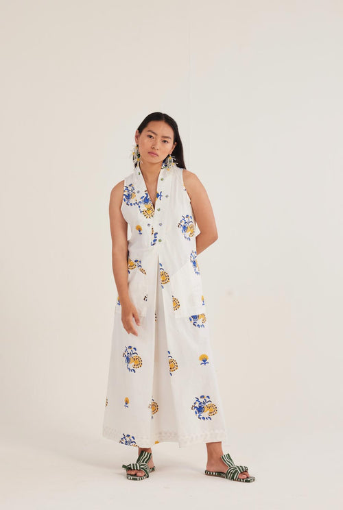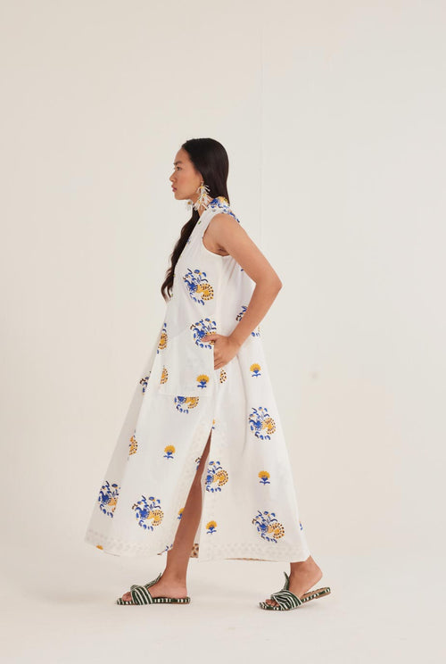 Summer whites for the win! A-line dress with box pleat in the front, v-neck and pleats on the side. Handblock printed in cotton.