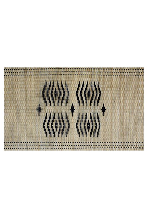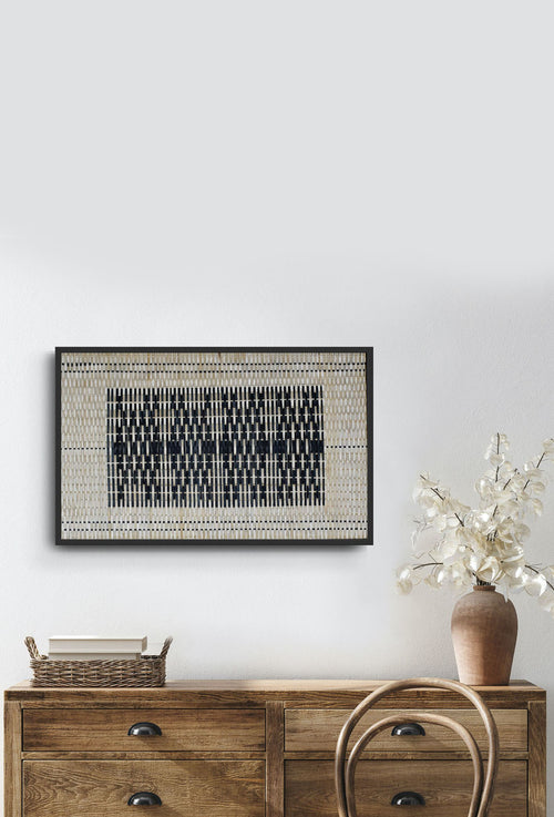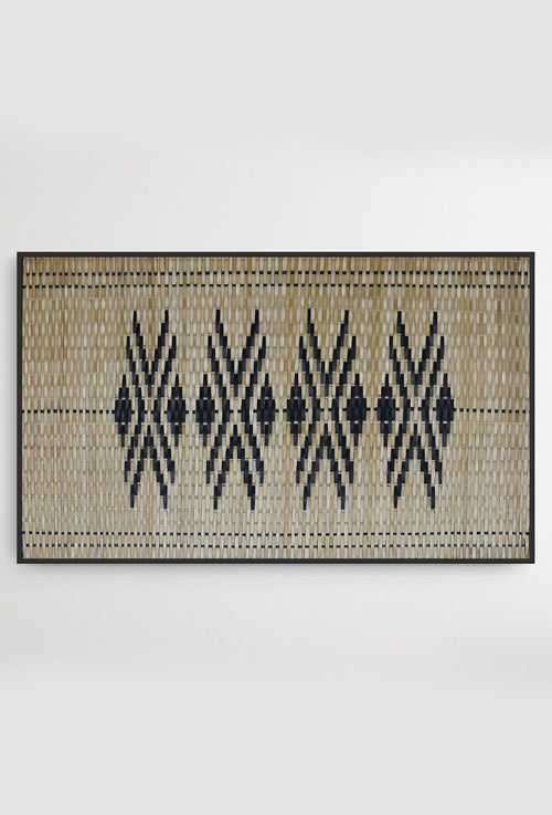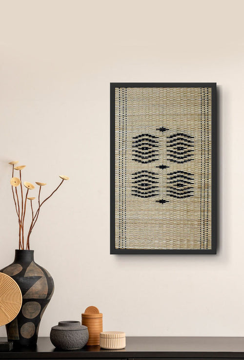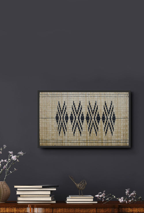 The Vismay Sangrah features woven geometric bamboo wall art, inspired by the free-hand facial and leg tattoos once prevalent among tribal women in North East India and various Southeast Asian countries. These intricate patterns, etched onto the skin, symbolized milestones such as coming of age, social standing, marital status, and personal growth. More than mere adornments, these designs held deep cultural significance, carrying the stories and identities of generations past. Through this collection, Pusaaka seeks to honor these traditional art forms, continuing the legacy with bamboo—the common medium that has long connected tribal communities. This piece is framed as shown.