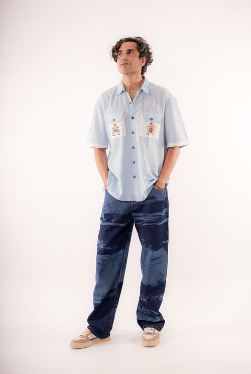 This relaxed button-down shirt has a drop-shoulder fit, colour-blocked embroidered flap pocket, and—wait for it—a hand-embroidered sumo wrestler on each pocket. Because why the hell not? Made from dyed Mangalgiri cotton for all-day comfort.