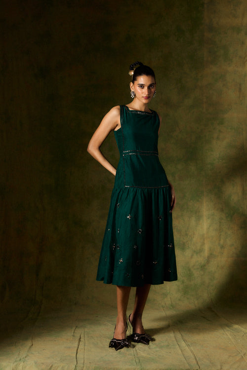 This dress crafted in taffeta silk, is all luxe without the fuss! With its rich, solid colour and subtle embroidered details, it’s the kind of dress that does all the talking. The tie-up bow at the back? A little extra touch of charm.