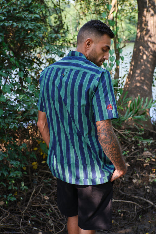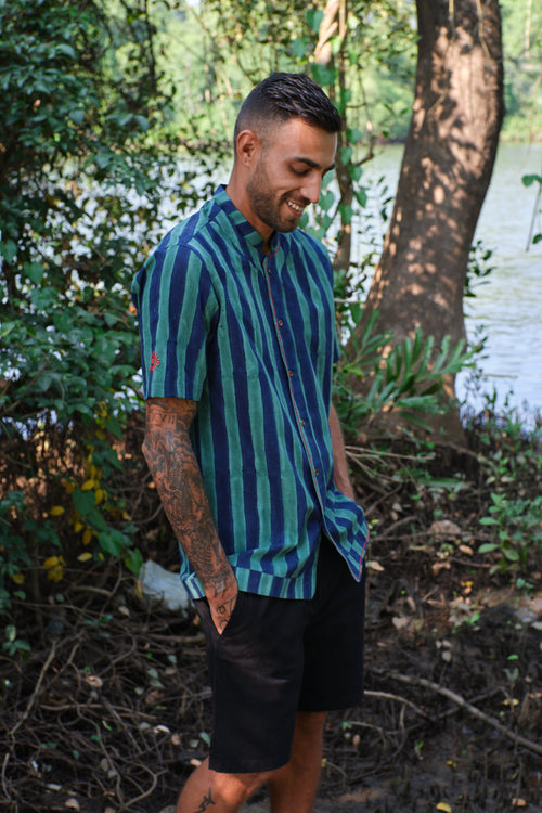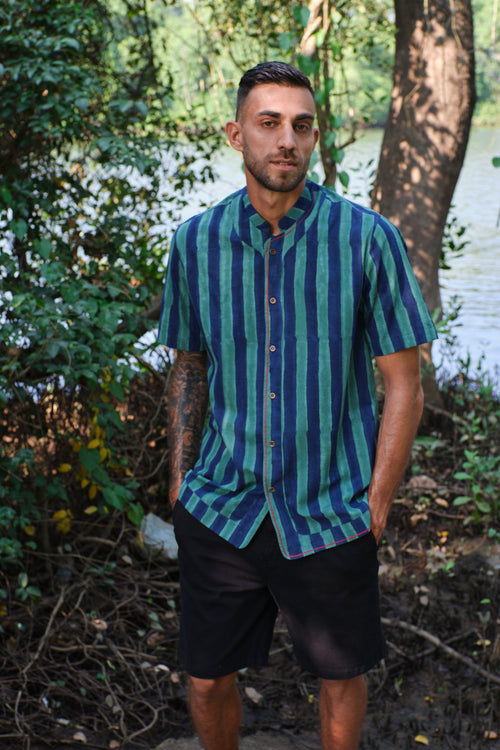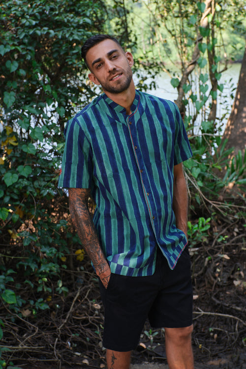 Crafted in bold hand block printed stripes, pay close attention to the finishing details - the red stitch line running through the front opening, metal buttons and the back flap detail.