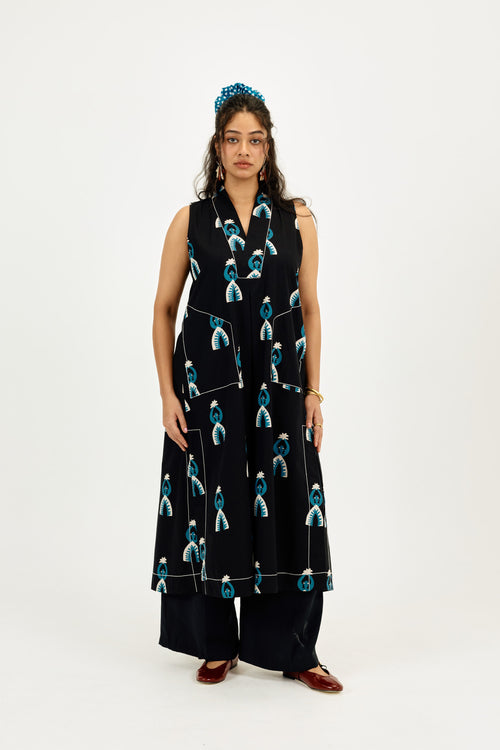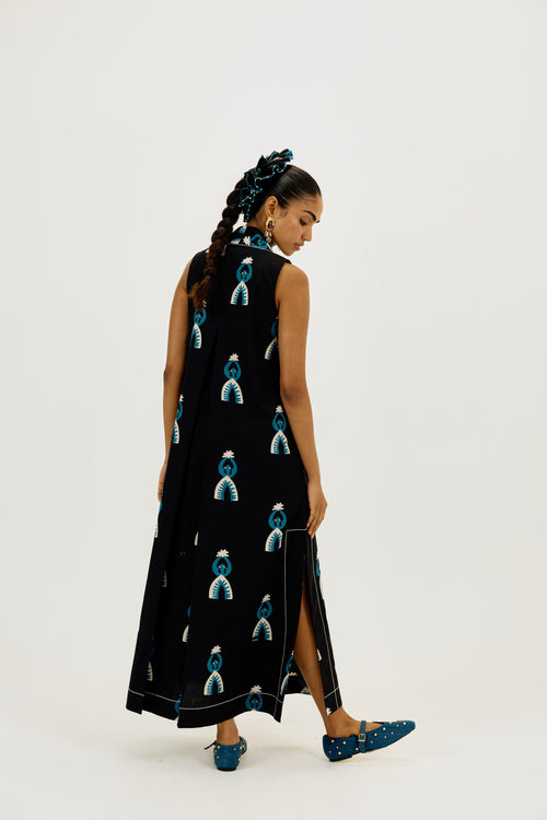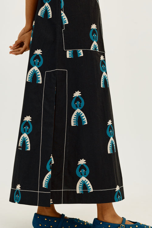 RSVP yes, thanks to this fabulous dress. This sleeveless midi dress is adorned with our bold tribal doll print. Designed with roomy patch pockets, a relaxed fit, and side slits on both sides for ease of movement and added flair. The clean V neckline and contrast topstitching make it feel polished yet unfussy. Wear it solo or layer it with a shirt for that effortless edge.