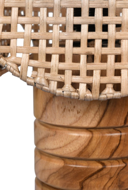 The Ahoto table lamp showcases a banded frame finished in natural Teak, exuding timeless elegance. Its intricately woven Cane lamp shade enhances its versatile charm. This delightful lamp effortlessly elevates any living room, home office, or bedroom with its understated yet refined presence.