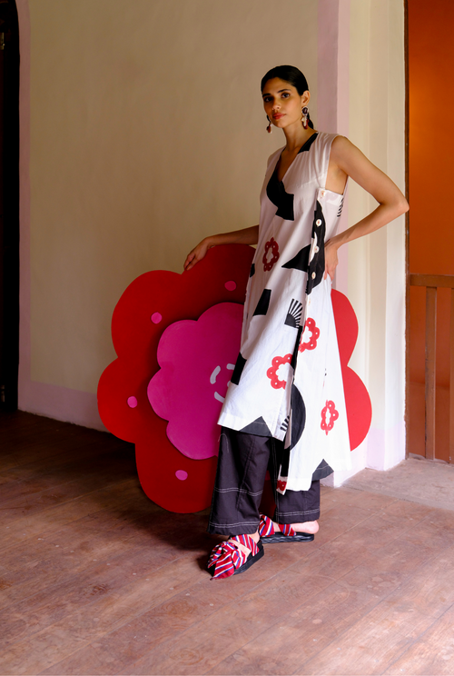 Looking for something bold but easy? This cotton kurta set has a striking block-printed geometric pattern that gives it a cool, graphic vibe. With a clean V-neckline, side buttons, and fun bead details on the back of the button, it’s laid-back but still makes a statement. It is paired with straight-fit trousers crafted in cotton.