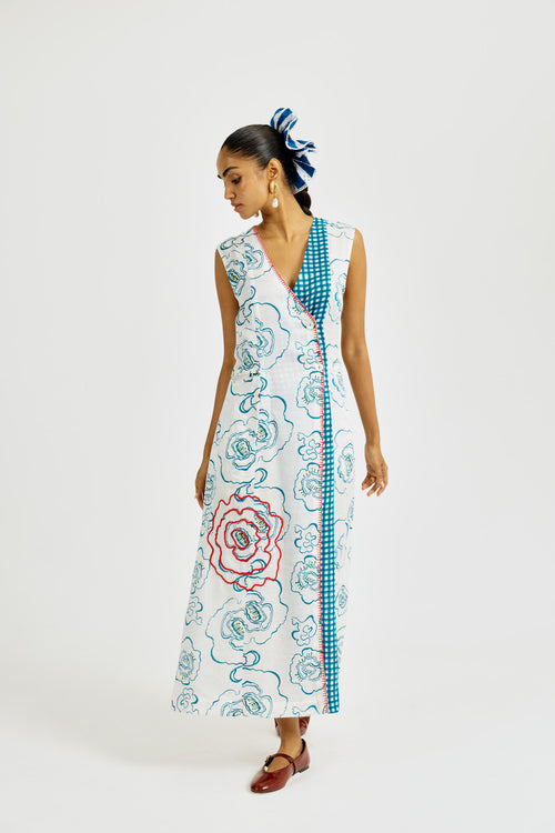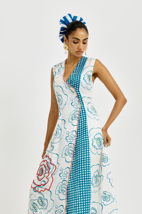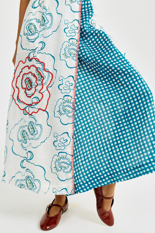 Our Amari dress is the perfect blend of bold pattern play and easy elegance. Crafted in linen satin fabric, this wrap-style midi dress features a delightful contrast of hand-block printed florals and checks — a JODI signature. We love how the red flower hand embroidery adds a playful pop.