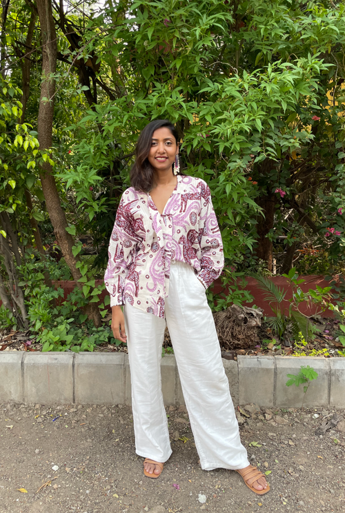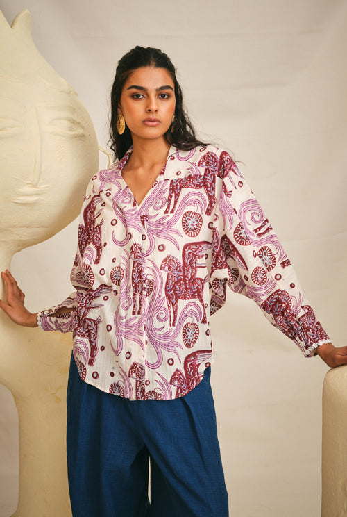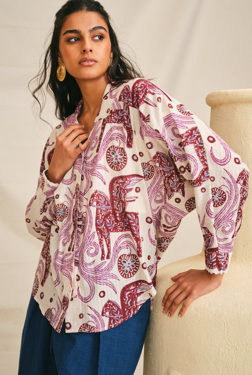 Handblock printed in vivid motifs on handwoven cotton, this shirt is effortless. It features a relaxed, oversized fit with a charming lace detail on the sleeve making it an easy way to level up your daily dressing.