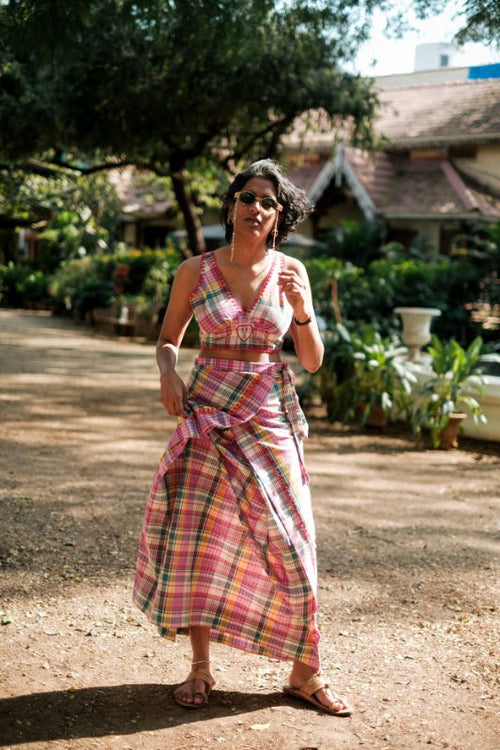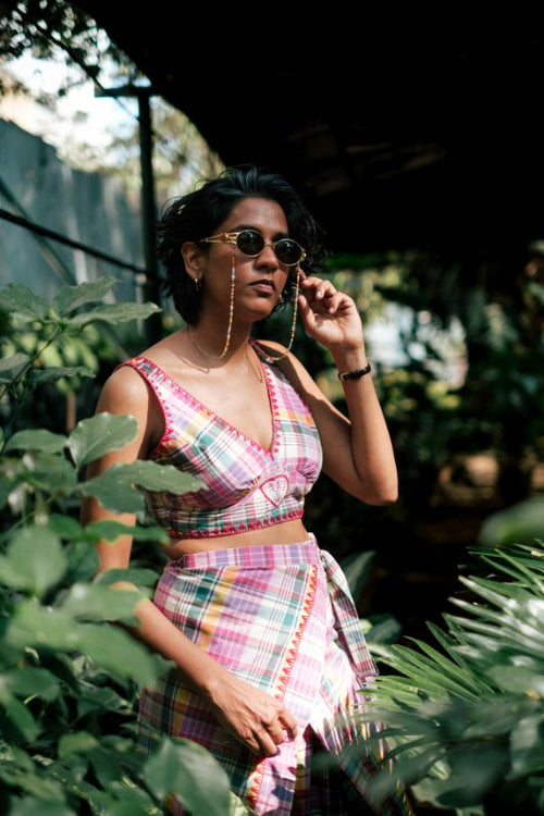 A vibrant top in cotton checks, featuring a deep V-neckline framed by intricate blanket stitching. Detailed with an embroidered heart at the center and finished with a tie-up back, this piece brings a dose of joy to your summer wardrobe.