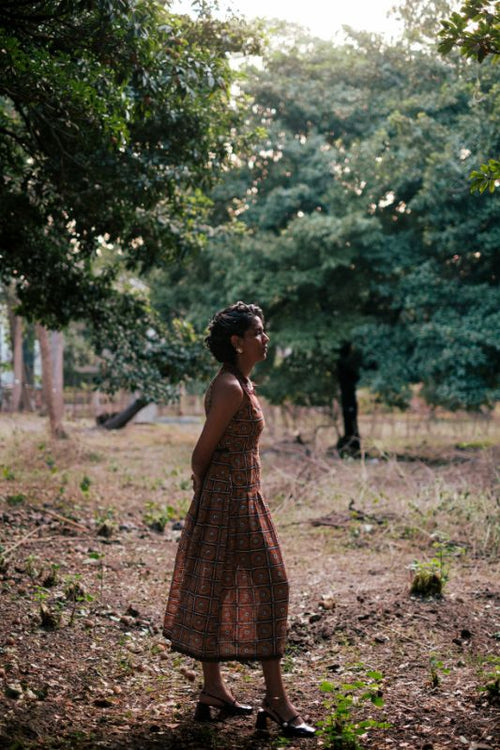 A block-printed sleeveless midi with a structured yet relaxed silhouette. The tonal brown collar features hand-done floral embroidery with French knots, flowing into a pleated hem finished with a scalloped edge.