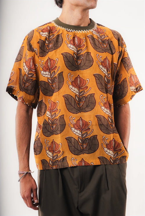 A tshirt so nice, you’ll want to wear it twice. Handblock printed woven t-shirt with a ribbed neck and hand embroidery.