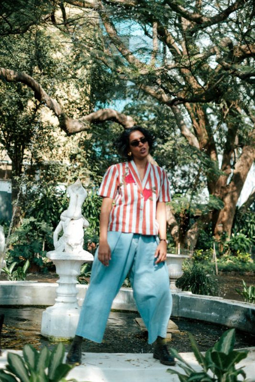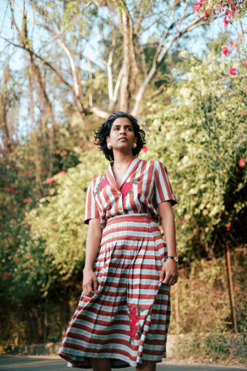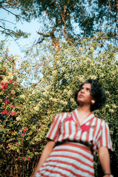 Made from hand block printed cotton featuring steady stripes, this blouse is defined by a collar and a button-down front, accented by vibrant flower appliqué blooming across the front.