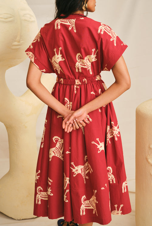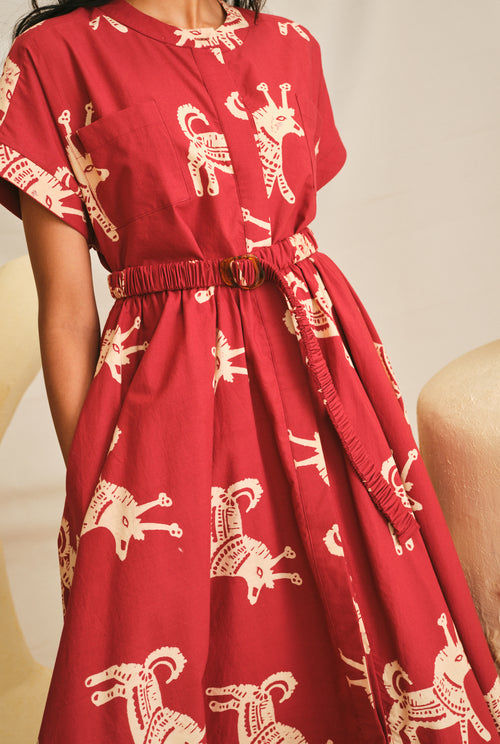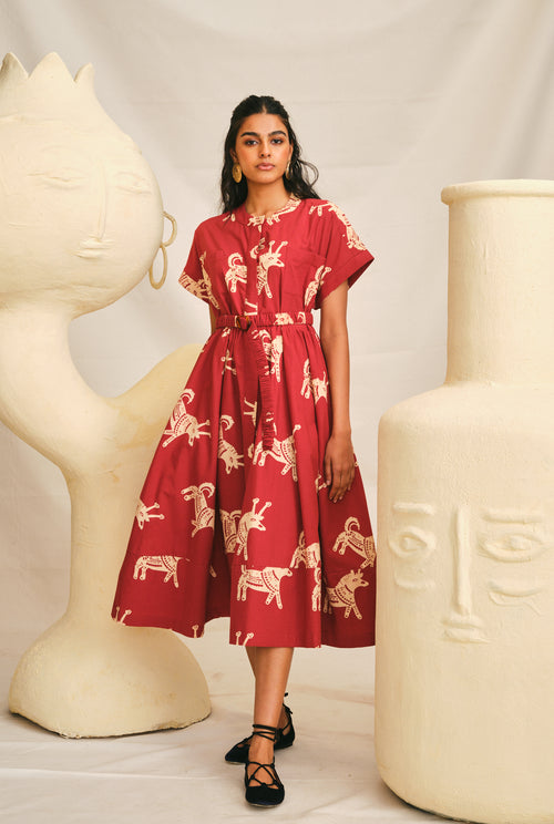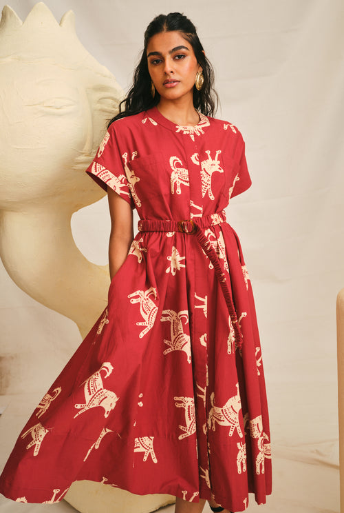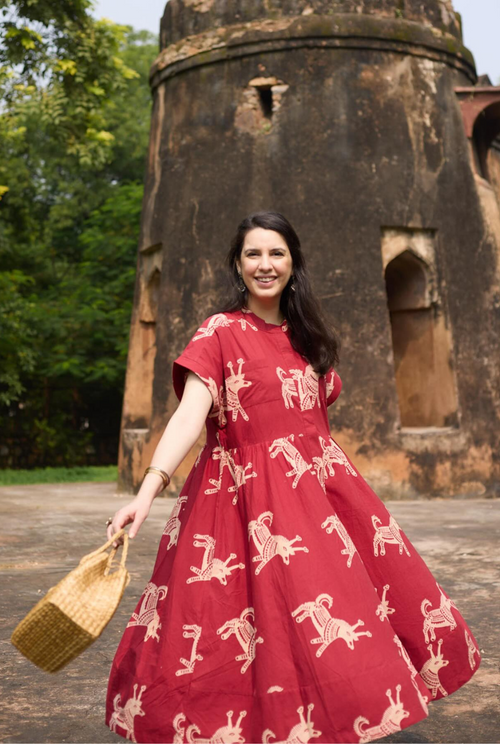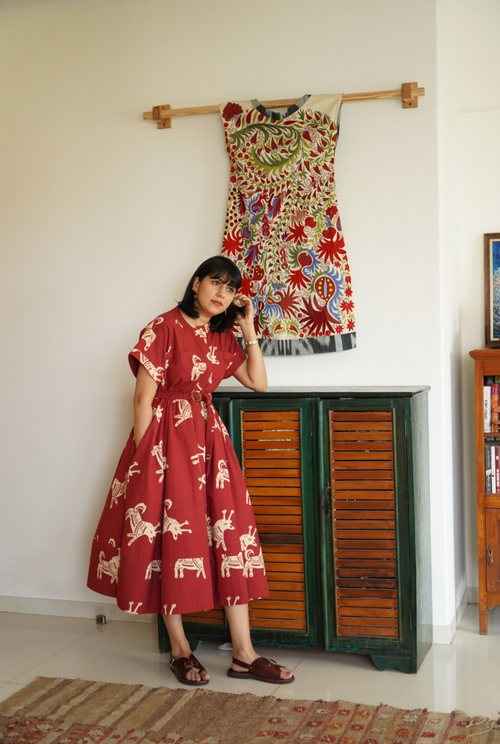 A dress that oozes style, and a dash of playful charm. The textile is handcrafted using the traditional technique of resist hand block printing. It features a modish neckline and a flowy tier. Wear with or without the waist belt as per your preference.