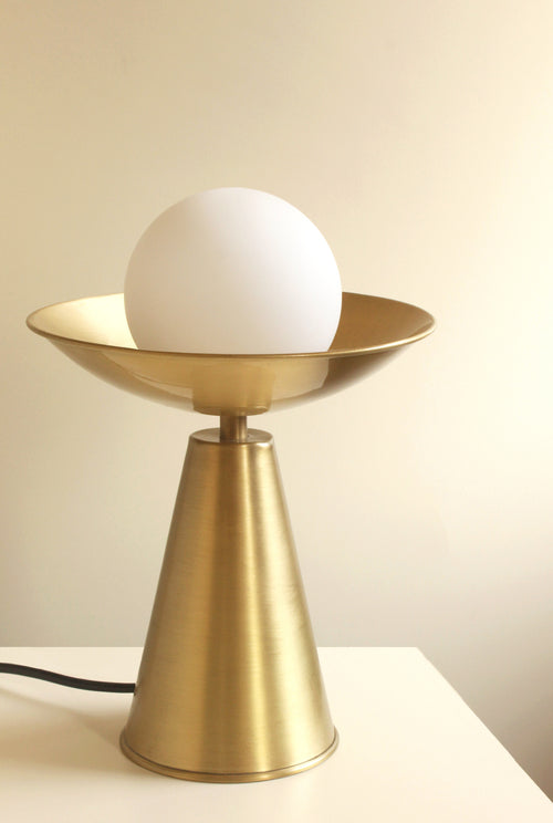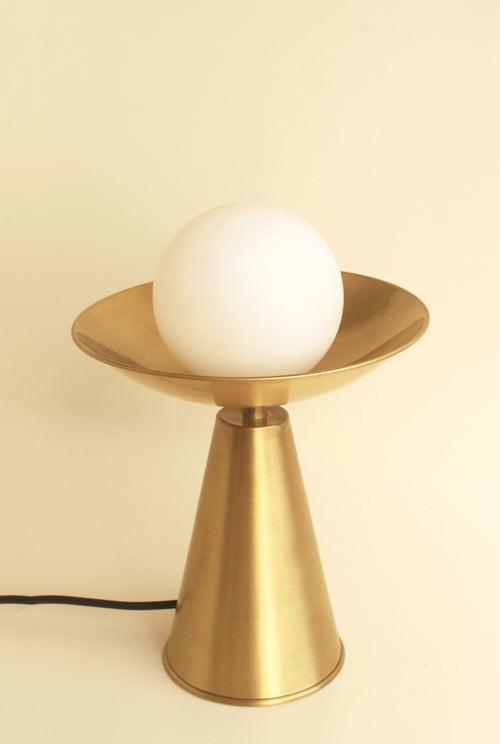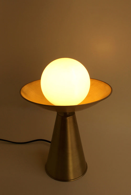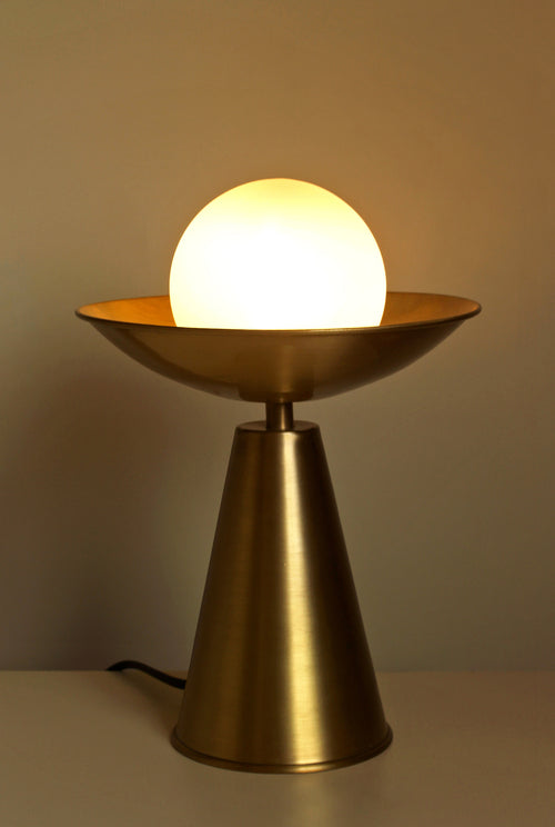 Like a fire torch, Ignis holds the warmly lit orb in its sleek and dynamic design. The brass lamp stands tall on your table top, a warm light spreading around its locus.