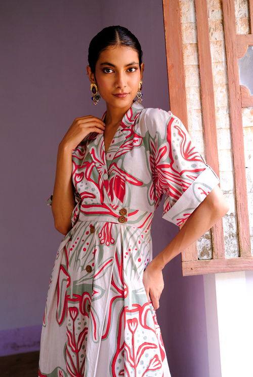 We’re digging the contrast of this structured wrap bodice with a box pleated silhouette, crafted in a bold, floral abstract print. The wrap waist is fastened with buttons that run down the front.