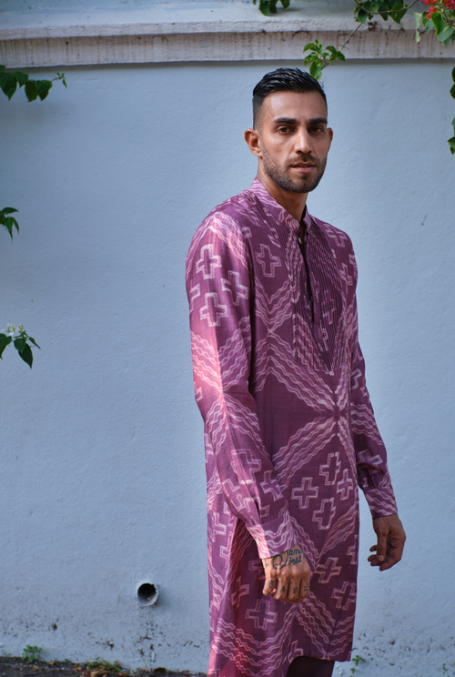 Handcrafted in muga silk, this fabric is clamp-dyed in plum tones using the shibori dyeing technique.  It features pintucks on the yoke and cut for a relaxed fit.