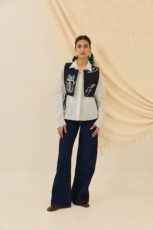 Cut from handwoven cotton, this black sleeveless bib is detailed with intricate white folk-inspired embroidery. Featuring tie-up sides for an adjustable fit, it’s the perfect layering piece to elevate any outfit. Wear it over our Saras shirt or flowy dresses for a touch of artisanal charm.