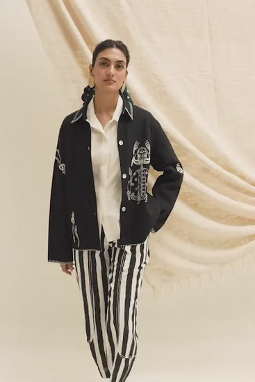 A relaxed, handwoven cotton jacket featuring our signature white folk-inspired embroidery. Designed with a button-down front, roomy sleeves, and contrast stitch detailing on the collar and hems, this piece adds an artisanal edge to any look. Layer it over your everyday separates for an effortlessly chic statement.
