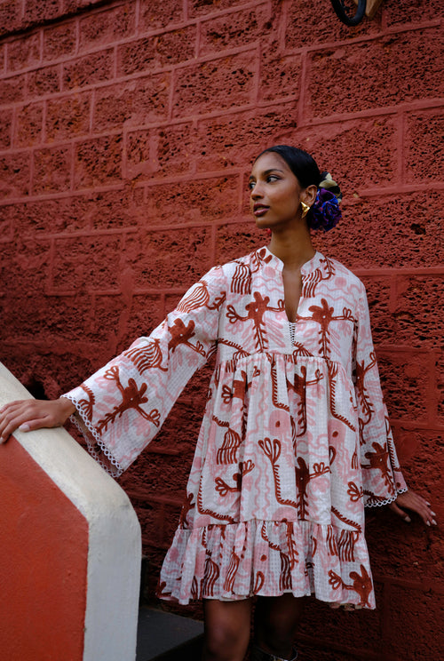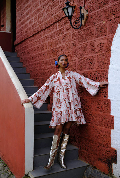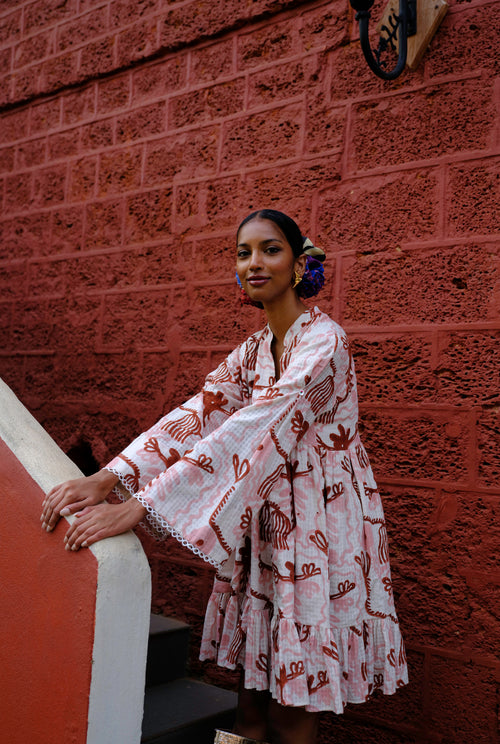Looking for something smart but sweet, short and neat? Look no further than this mini dress. Handcrafted in self-chequered lightweight handloom fabric in a distinct JODi print, it features a flowy tiered silhouette with wide flared sleeves and an open neck. We’ve added subtle lace edging on the sleeves and hand embroidery on the neck.