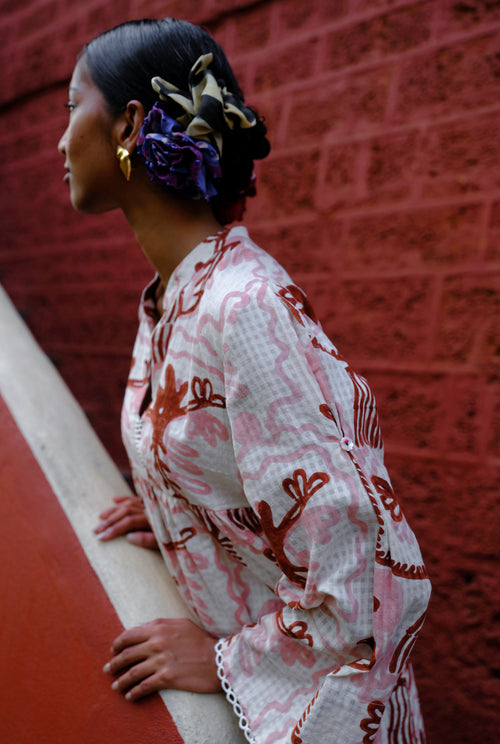 We believe customers have a right to know how their product was made. 3.25 metres of handloom fabric sourced from West Bengal has been used for this piece. Hand printed by our artisans in Jaipur, manufactured in our workshop at Pune India.