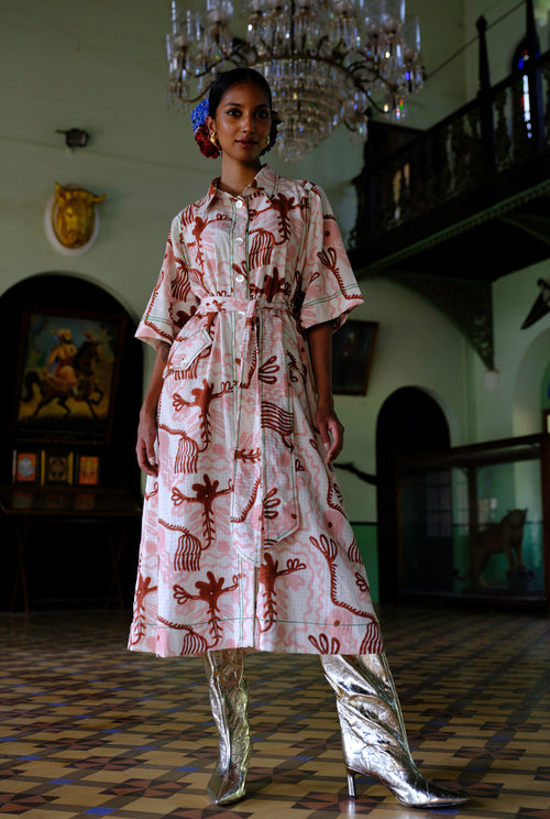 We are fans of shirt dresses. Our Karikku shirt dress has an oversized shirt-style silhouette that's complete with a tie up belt to cinch in your waist. It has a structured silhouette and a cool sleeve detail with a green contrast stitch all over.