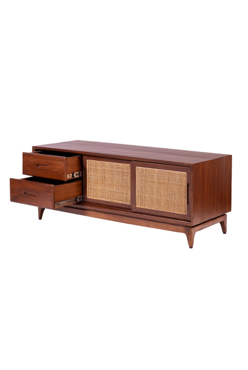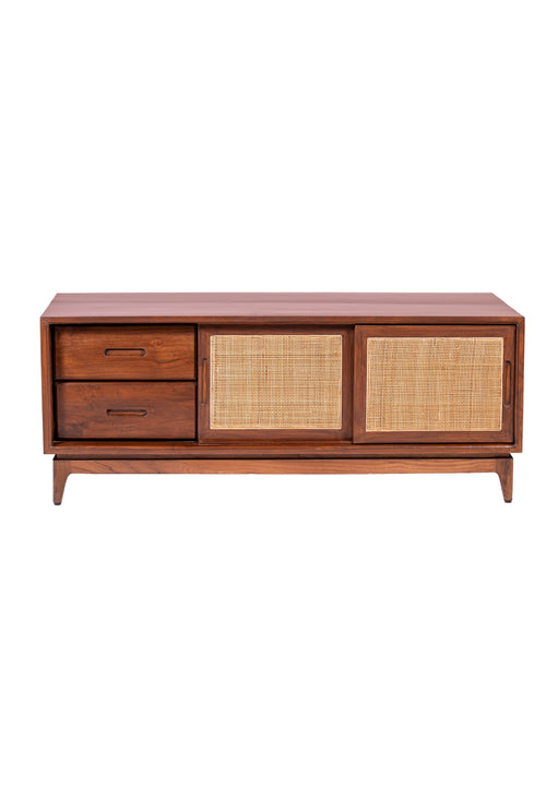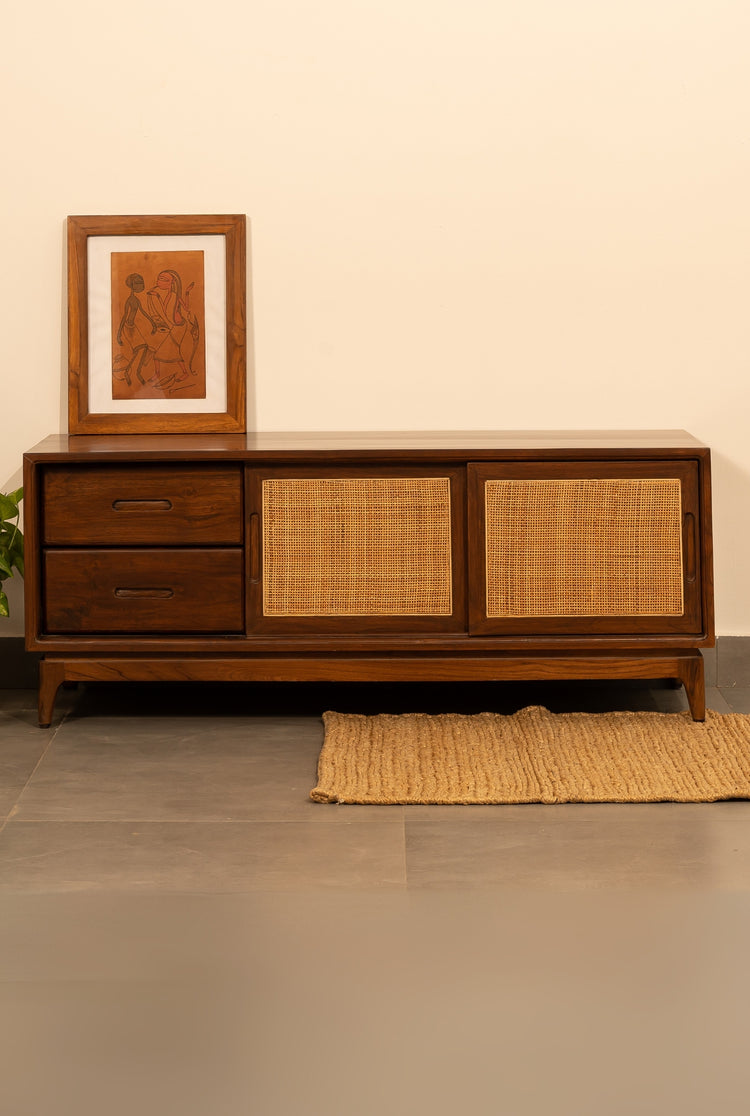 KIVO TV unit is a sleek and simple piece crafted from teak wood, featuring sliding doors and drawers with natural rattan accents. Its clean lines and understated design bring warm, modern functionality to your living space.
