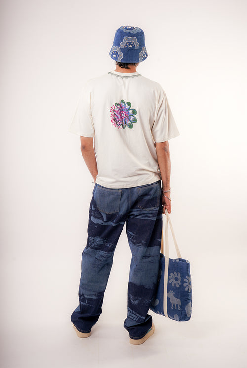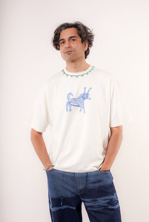 A t-shirt so nice, you’ll want to wear it twice. Handblock printed knit t-shirt with a ribbed neck and hand embroidery.