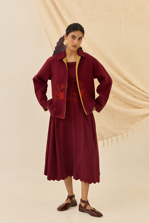 A versatile, reversible Kala Cotton jacket in rich maroon, featuring a classic collar and full sleeves. It is accented with bold yellow contrast piping and a scalloped edge detail along the placket, hem, and back yoke. One side features tonal red floral appliqués for an artisan touch, while the reverse offers a striking woven stripe, giving two unique looks in one.