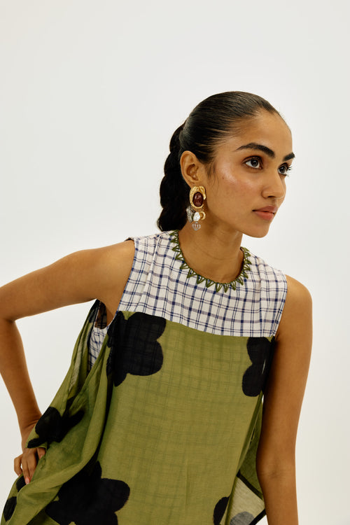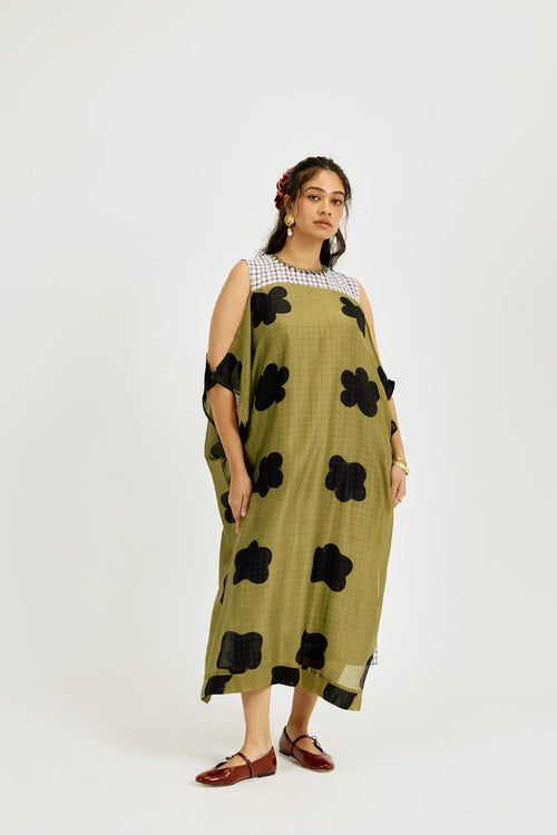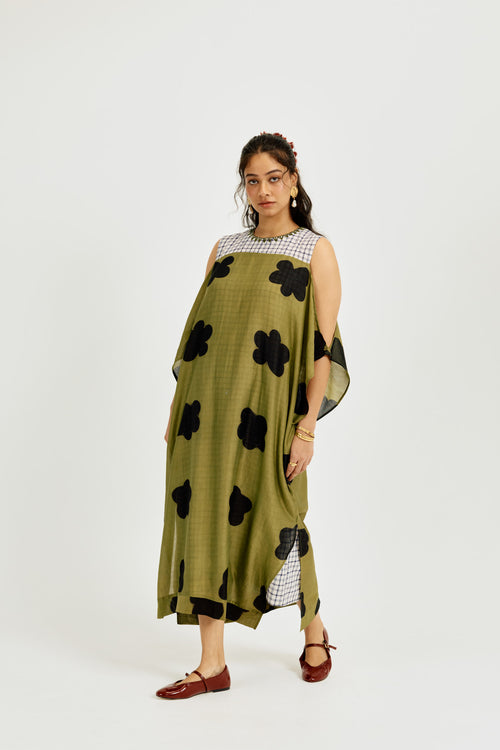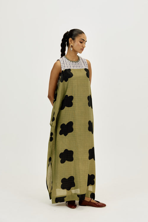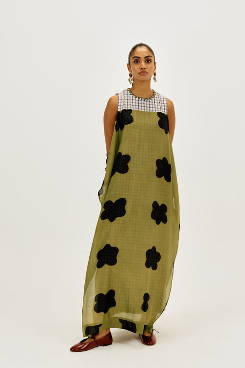 A statement piece that feels as comfortable as it looks striking. This relaxed-fit maxi dress is crafted in airy clamp-dyed Chanderi fabric. The contrast full checkered lining brings playful structure to the flowy silhouette.