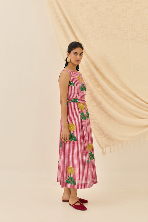 A classic sleeveless midi dress in a lively pink hand-block print. It features a flattering fitted bodice, a boat neckline, and a pleated skirt silhouette. Cinched at the waist with a self-fabric belt, this dress beautifully accentuates the waist for an effortlessly feminine look.