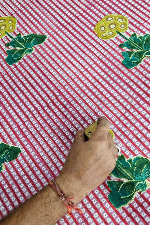 Our product is hand-block printed in Jaipur, India, using techniques of traditional handblock printing. Subtle variations in patterns are natural to this process. We believe this makes each creation unique and charming. Some call it je ne sais quoi. We call it JODI.