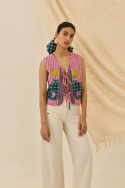 A spirited, cropped waistcoat combining a vibrant mix of hand block prints, including the signature floral print and check print. This unique piece features a deep V-neck and a whimsical tie-up front closure. It is artfully combined with floral check pockets, celebrating Jodi's maximalist approach to pattern mixing and artisan craft.