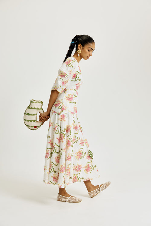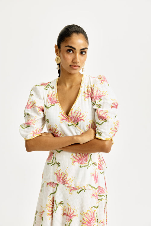 Say hello to effortless elegance. Our Moor Wrap Dress features block-printed florals in vibrant pink and green on handwoven cotton. The wrap silhouette flatters all body types with a tie-up detail that cinches at the waist. Puff sleeves with delicate hand embroidery add a playful, feminine touch. Our product is hand-block printed in Jaipur, India, using techniques of traditional handblock printing. Subtle variations in patterns are natural to this process. We believe this makes each creation unique and charming. Some call it je ne sais quoi. We call it JODI. If you wish to have the length of the garment altered, please mention your request in the special instructions section at checkout, with your desired length, customisation charges may apply. |
