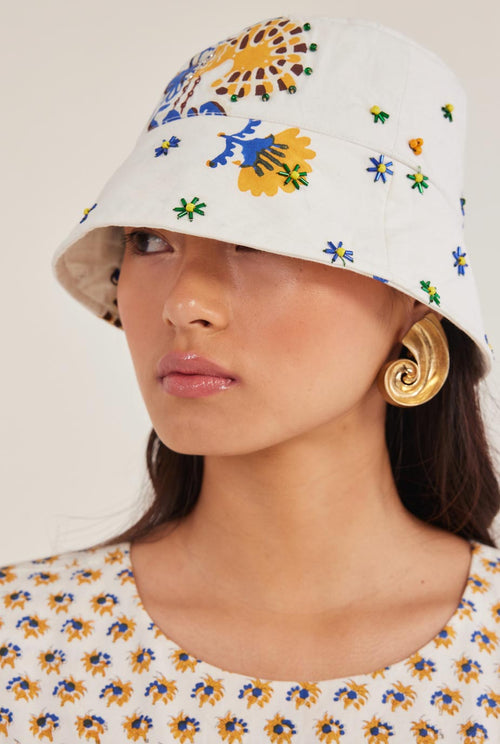 Moro embroidered bucket hat- Your ultimate summer sidekick is here. Handblock printed in soft cotton and dotted with the sweetest little beaded embroidery, this hat is equal parts charming and practical. Perfect for beach days, brunches, and all your sun-soaked escapades.