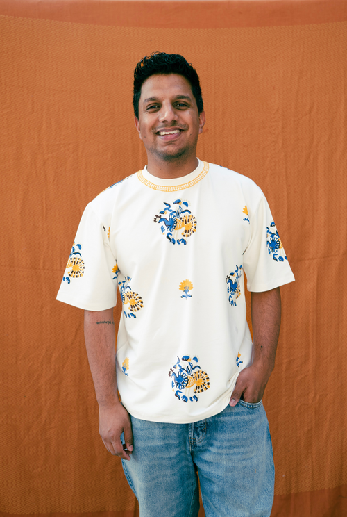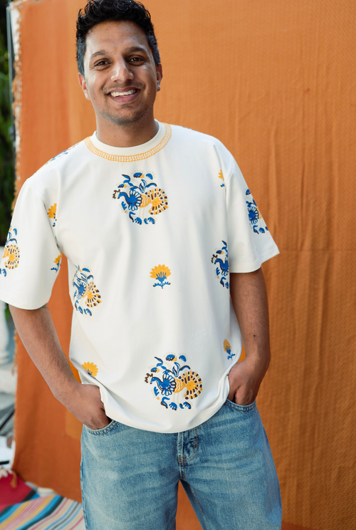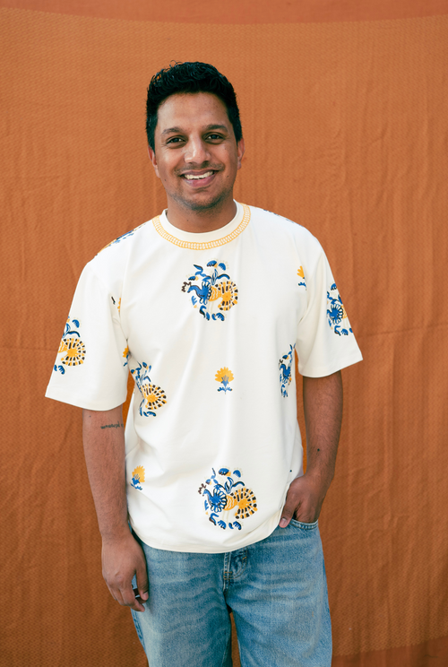A t-shirt so nice, you’ll want to wear it twice. Hand block printed woven t-shirt with a ribbed neck and hand embroidery.