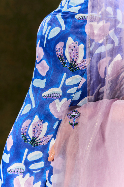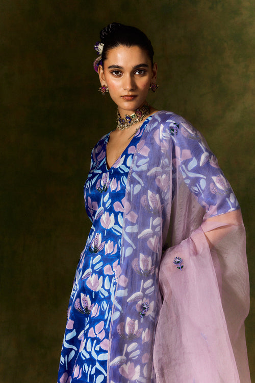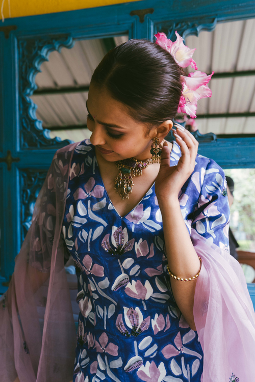 We love a classic, and our JODI kurta set returns in a new, vivid print. Crafted in lustrous silk, this kurta set features a V neckline with tailored, cropped trousers. The bold floral print is hand-embroidered to add grandeur. Complete the look with our hand-embroidered sheer and lightweight organza dupatta.