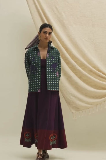 A stylish, boxy cropped jacket in a signature hand-block check print. It features a classic collar and full sleeves. The jacket is playfully decorated with contrasting purple floral appliqués on the front, providing an eye-catching layering piece that celebrates print-on-print and vibrant, handcrafted detail.