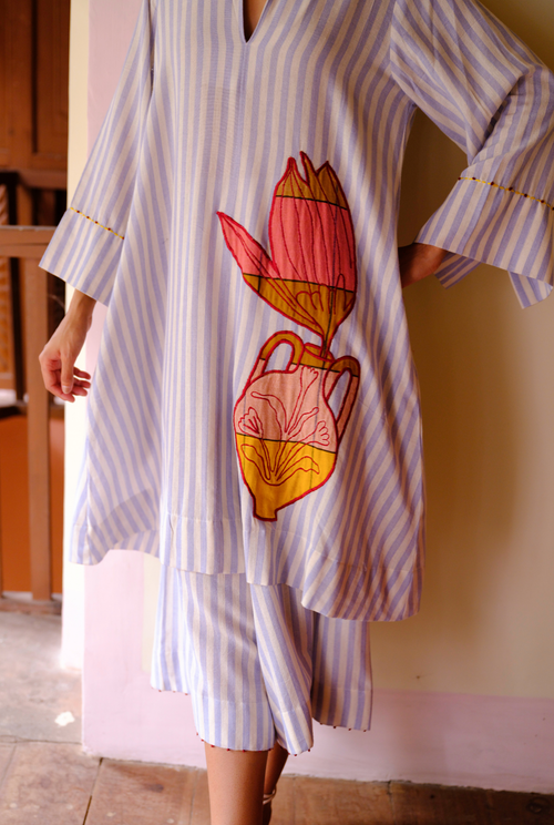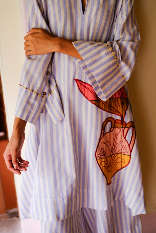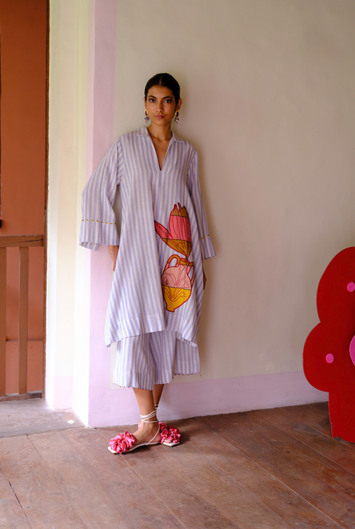 A set you can live in! This set has a semi-flared kurta with bell sleeves, featuring bold appliqué embroidery, along with hand-embroidered details on the sleeve. Crafted in handwoven cotton, it’s roomy enough to lounge in all day long. Wear with our matching culottes with an embroidery detail at the hem.